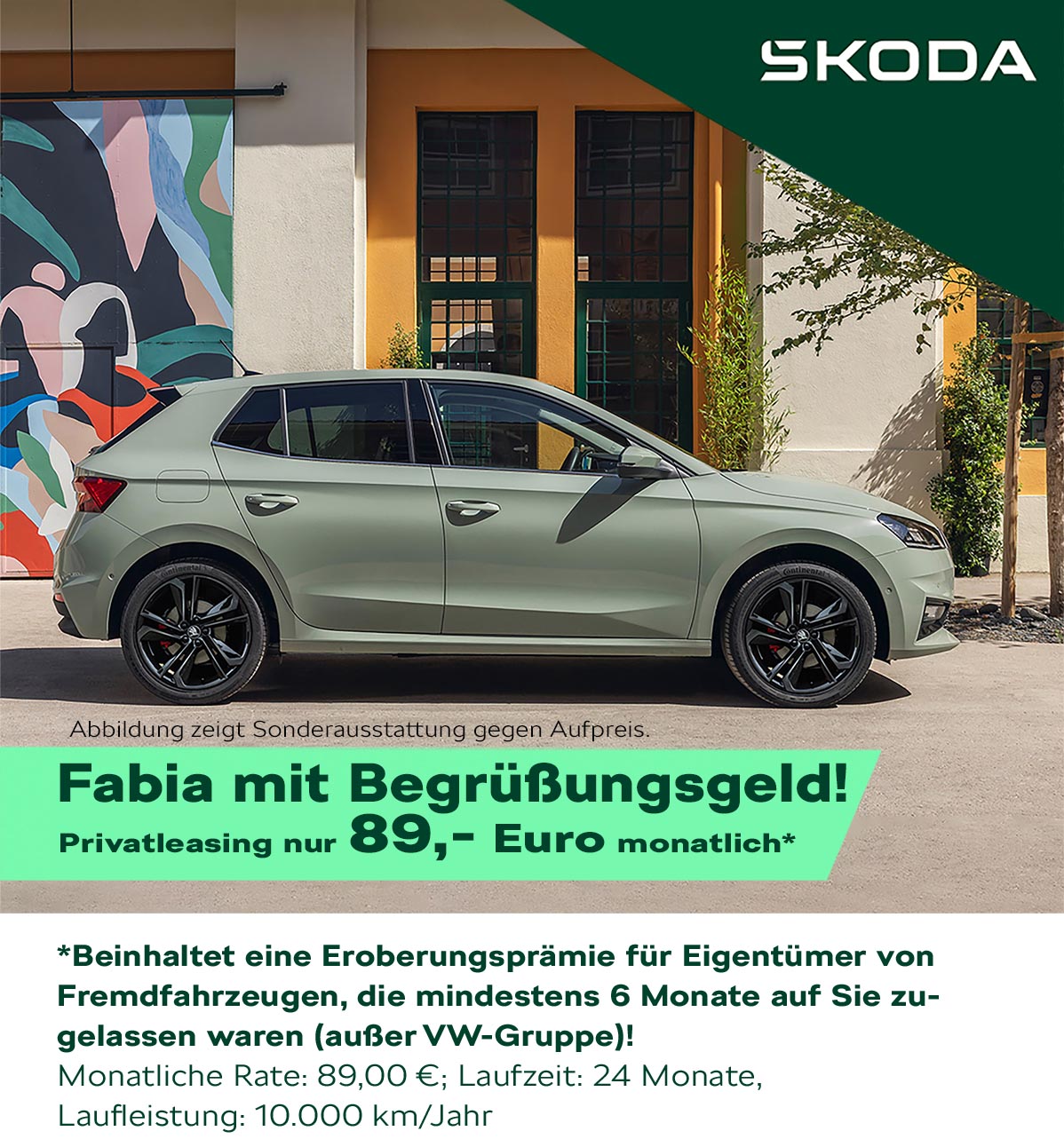 Nur bis 30.6.2026 gilt unser Angebot für den Škoda Fabia 1,0 MPI 59kW mit 5-Gang-Schaltgetriebe. Das Angebot beinhaltet ein Begrüßungsgeld für Eigentümer von Fremdfahrzeugen (außer VW-Gruppe), das Fahrzeug muß mindestens 6 Monate auf den Käufer zugelassen gewesen sein. Bei einer jährlichen Laufleistung von 10.000 km und 24 Monaten Vertragslaufzeit liegt die Rate bei sensationellen 89,00 Euro im Privatleasing. Worauf warten Sie noch?